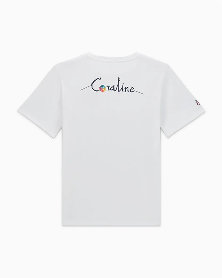 Converse celebra il 15° anniversario di “Coraline e la porta magica”, amatissimo film prodotto da LAIKA, con una collezione in edizione limitata che include questa t-shirt unisex in jersey di cotone. Il design presenta un’etichetta che rende omaggio al 15° anniversario del film, una grafica con stampa in rilievo della bambola sul davanti e una grafica di Coraline sul retro.