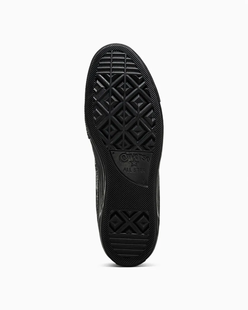 Questa Chuck 70 in edizione limitata si rinnova con un design in pelle premium total black, per un look d’ispirazione heavy metal. Per donare ancora più glamour a questo modello, abbiamo aggiunto una luccicante placchetta argento sulla punta, che ruberà senza dubbio la scena.