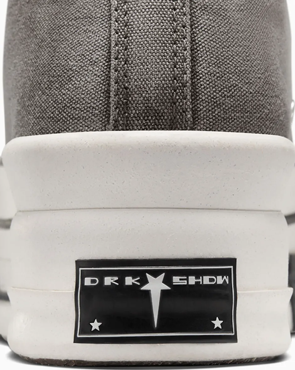 - Targhetta con logo DRKSHDW sagomata e personalizzata sul tallone sinistro, targhetta con logo e branding Converse sul tallone destro