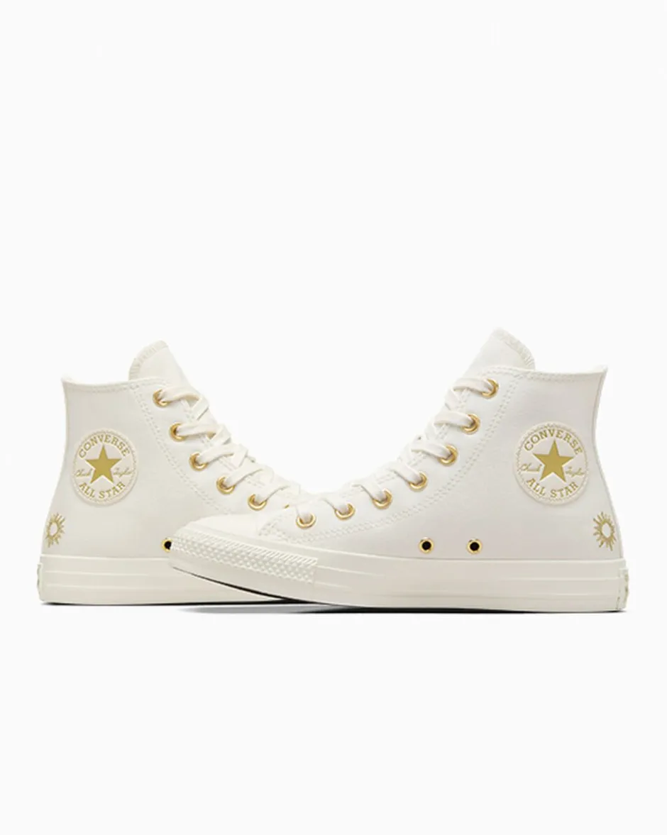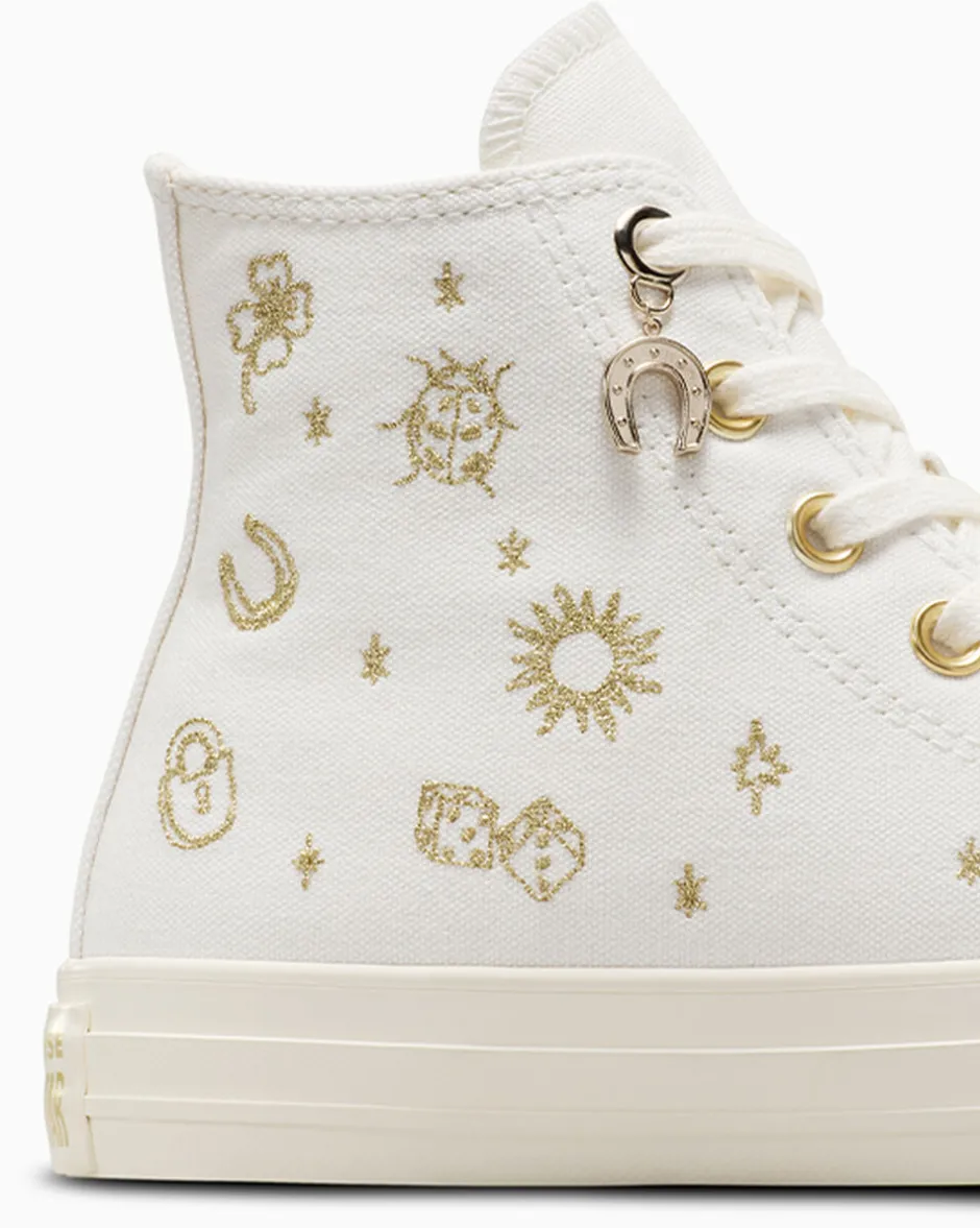 Il tuo futuro brilla di prosperità. C’è scritto in oro su queste Chuck. Talismani ricamati e portafortuna sui lacci per passi fortunati.