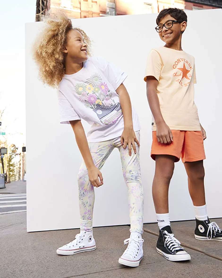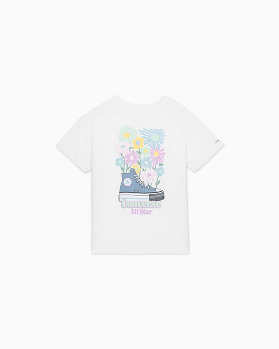 Questa t-shirt morbida e confortevole è ideale per completare il look dei tuoi piccoli. La grafica con fiori colorati e la classica Chuck Taylor valorizzerà il loro outfit casual, rendendolo leggendario.