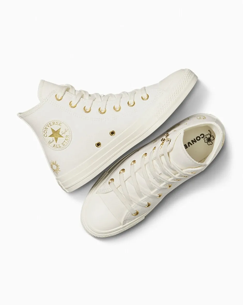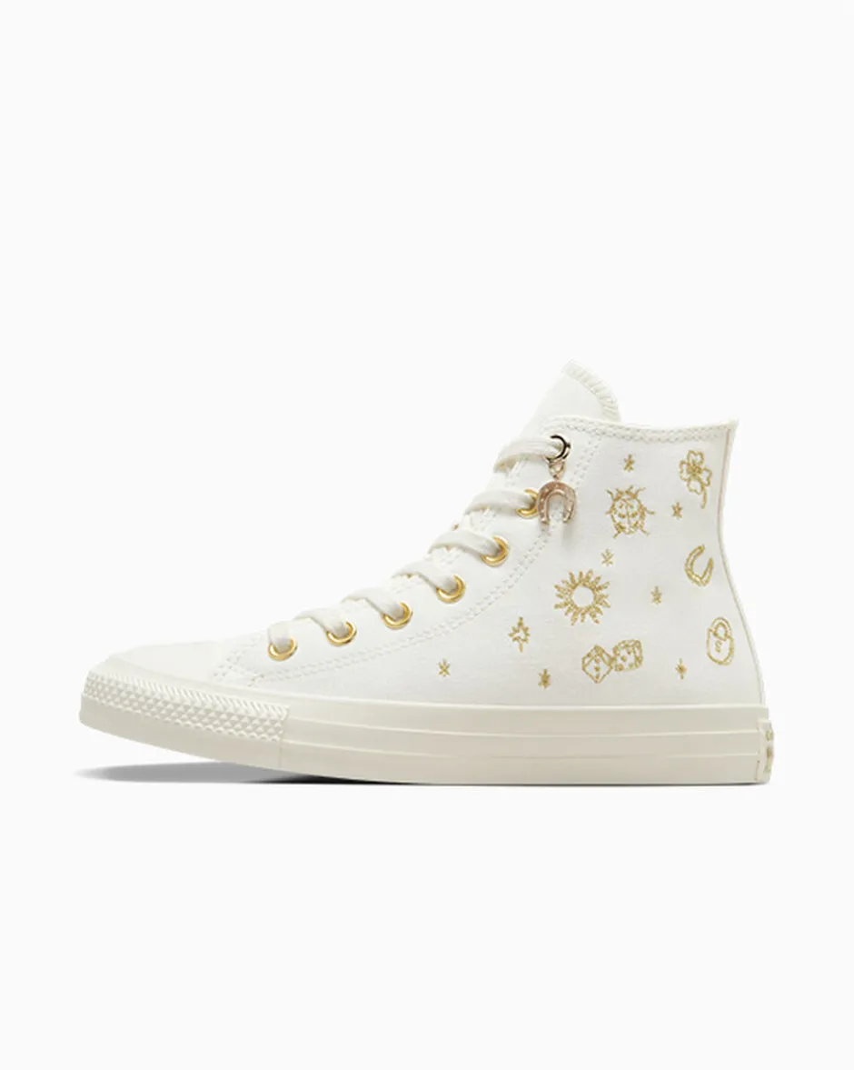Il tuo futuro brilla di prosperità. C’è scritto in oro su queste Chuck. Talismani ricamati e portafortuna sui lacci per passi fortunati.